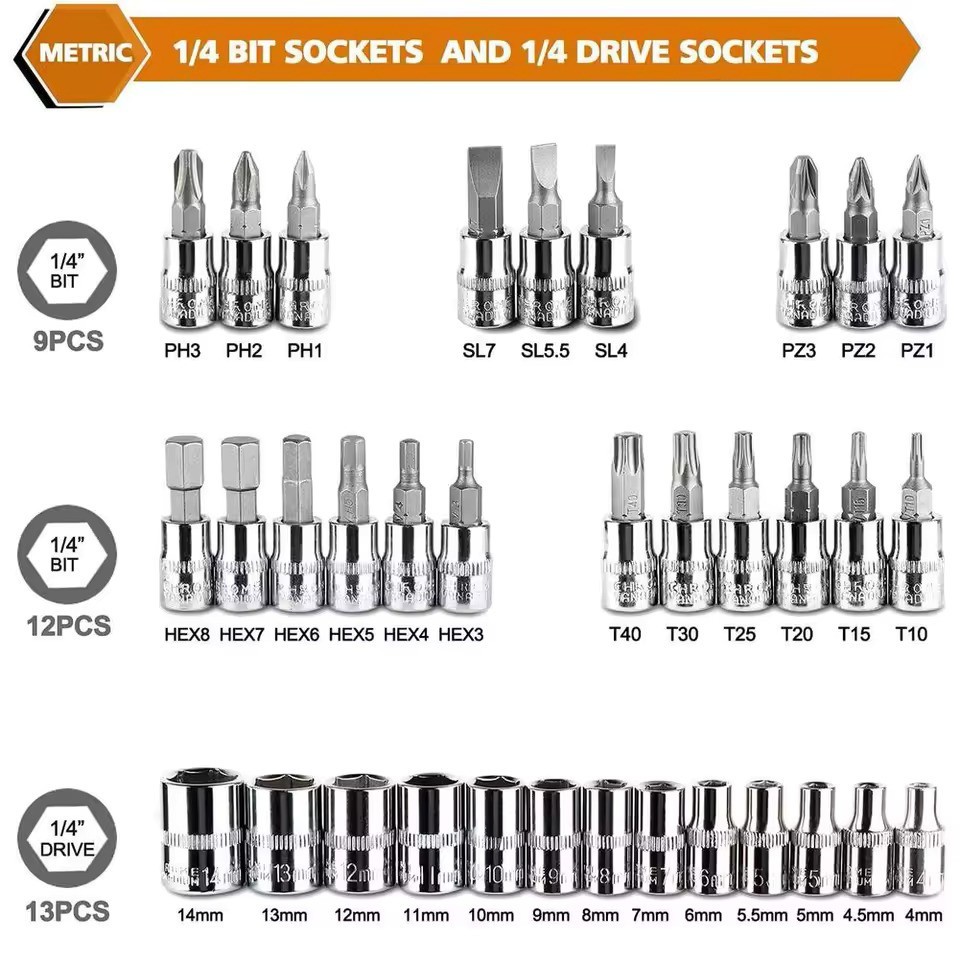 13 x 1/4” Hex Sockets: 4mm, 4.5mm, 5mm, 5.5mm, 6mm, 7mm, 7.5mm, 8mm, 9mm, 10mm, 11mm (x2), 12mm, 13mm, 14mm